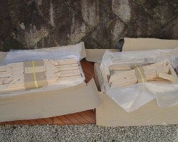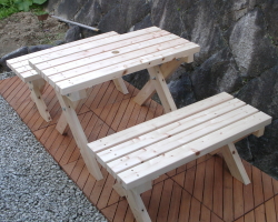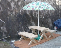 ボルトで組み上げて、簡単に完成。 はっきり言って安物なので、作りは荒いかも。。。 節がやたらとあって、おそらく一般木材の余り木でできている。。。 でもうちの庭にはこれで十分。一応ヒノキだしね。 テーブルとベンチの表面はちゃんとなめらかに削ってあるので、 使用には問題なし。 構造が単純なので、頑丈そうだ。 テーブルには、あらかじめパラソル用の穴加工を頼んでおきました。 |